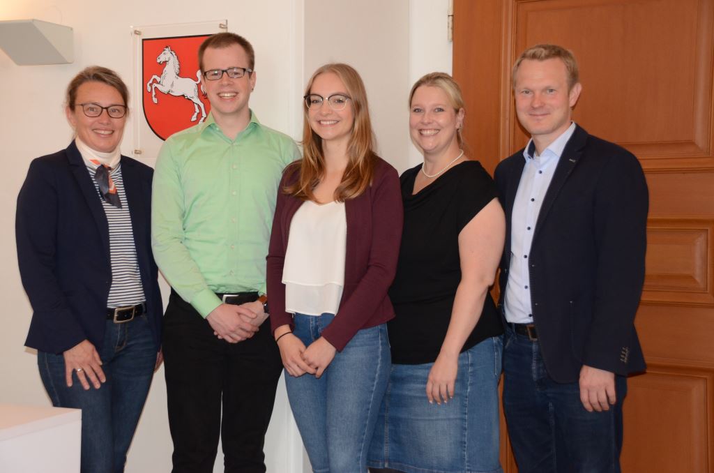 Das Foto (von Irene Rosenzweig) zeigt von links nach rechts: Direktorin des Amtsgerichts Susanne Kirchhoff, Janis Lotte, Alina Schnieder, Ausbildungsleiterin Anja Wendtland, Geschäftsleiter des Amtsgerichts Bernd Pellmann.