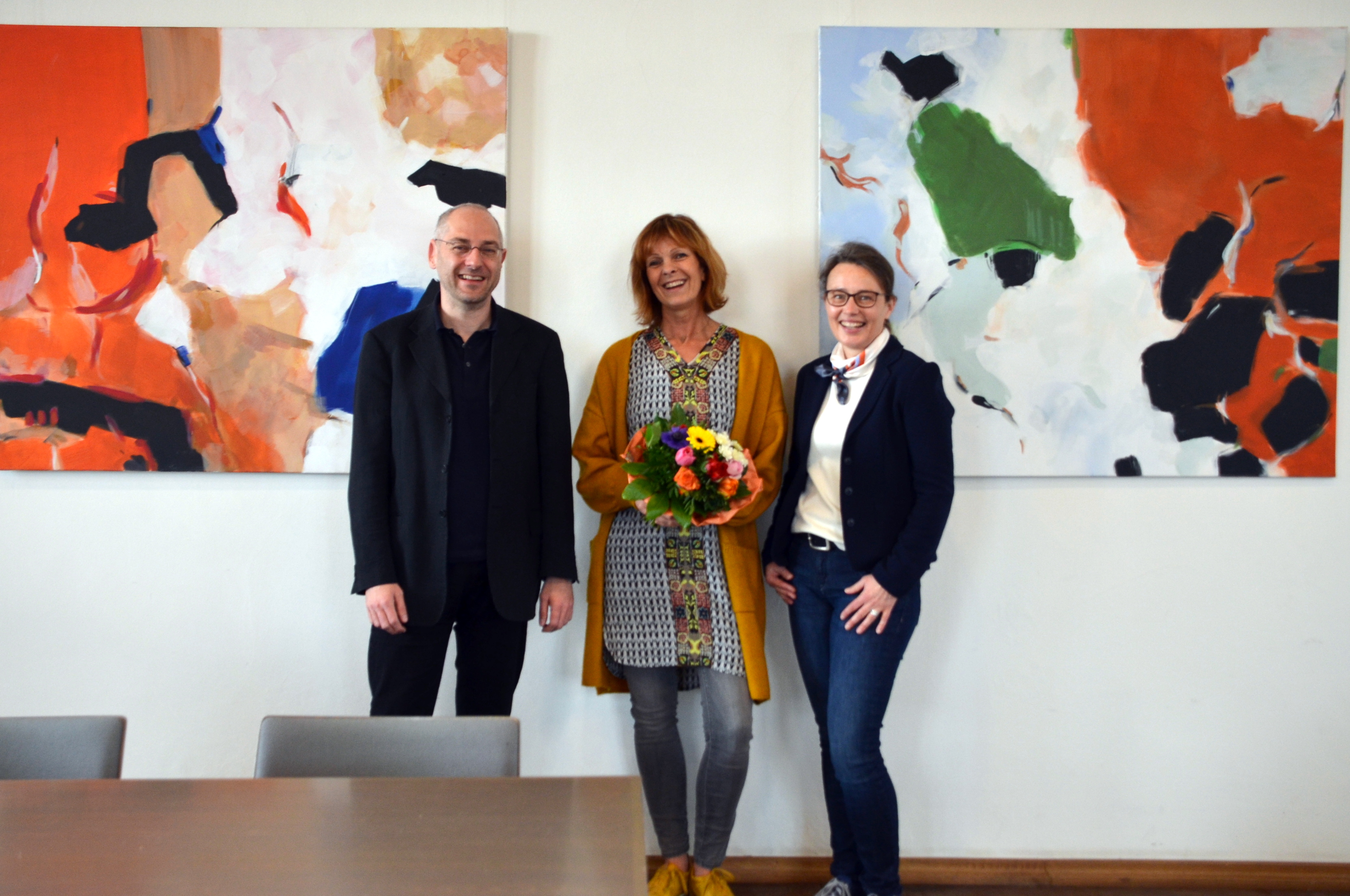 „Kunst und Amtsgericht, das passt prima zusammen: Beide brauchen Öffentlichkeit!“, freute sich Susanne Kirchhoff, Direktorin des Amtsgerichts. Sie bedankte sich bei Kerstin Himmerlich mit einem Blumenstrauß für die Bilder und bei Richter am Amtsgericht Dr. Peter Backhaus, der den Kontakt hergestellt hatte.